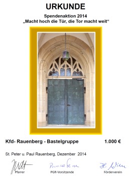 Die Vorstandschaft des Fördervereins Kirche St. Peter und Paul Rauenberg bedankt sich bei der Bastelgruppe der katholischen Frauengemeinschaft für die hohe Spende von 2000 Euro. Diese Spende unterstützt die vielfältigen Aufgaben „Rund um unsere Pfarrkirche“. Herzlichen Dank und „Vergelt's Gott“ an alle Mitglieder der Bastelgruppe.