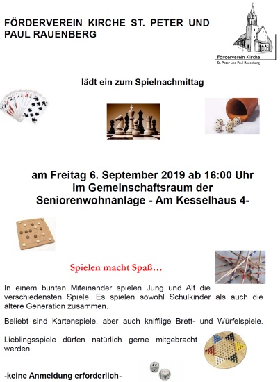 Der Fördervereins Kirche St. Peter und Paul Rauenberg lädt am Dienstag, 24. Oktober 2008 um 16.00 Uhr zum Spielenachmittag ein: